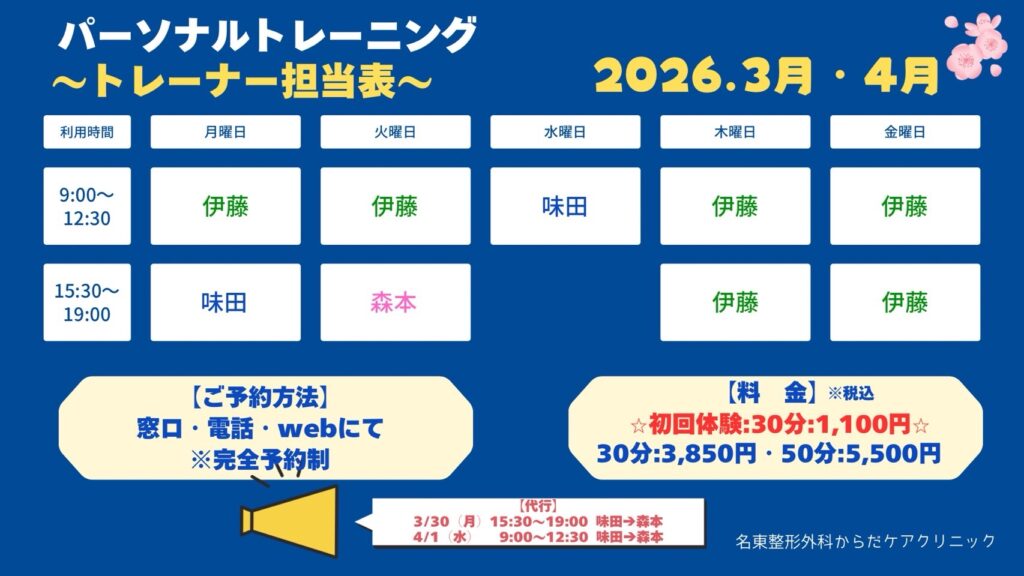 3月・4月のパーソナルトレーニング トレーナー担当表になります。