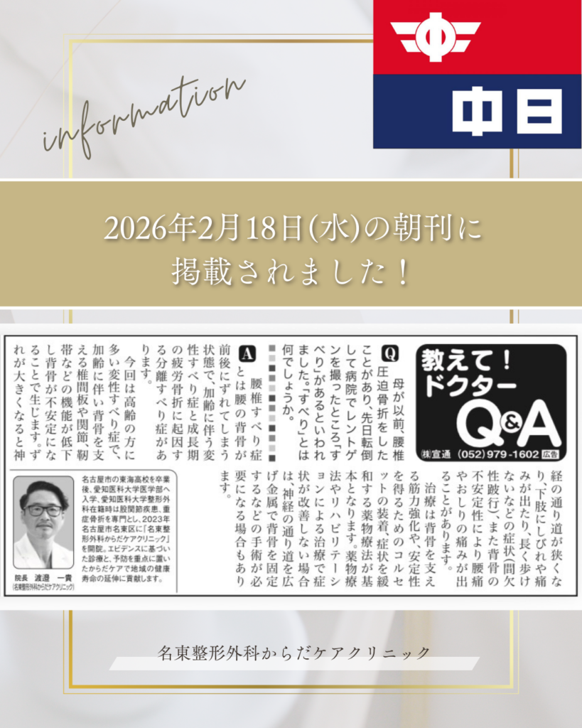 2026.03.20 お知らせ 2026.03.20更新 中日新聞朝刊に掲載されました! この度、2026年2月18日(水)中日新聞朝刊に当クリニックの院長が掲載されました。 今後も地域の皆さまに寄り添い、安心して通っていただけるクリニックを目指してまいります。