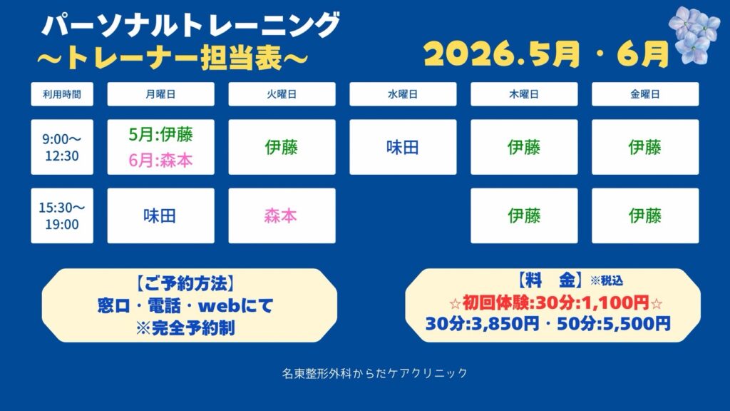 5月・6月のパーソナルトレーニング トレーナー担当表になります。