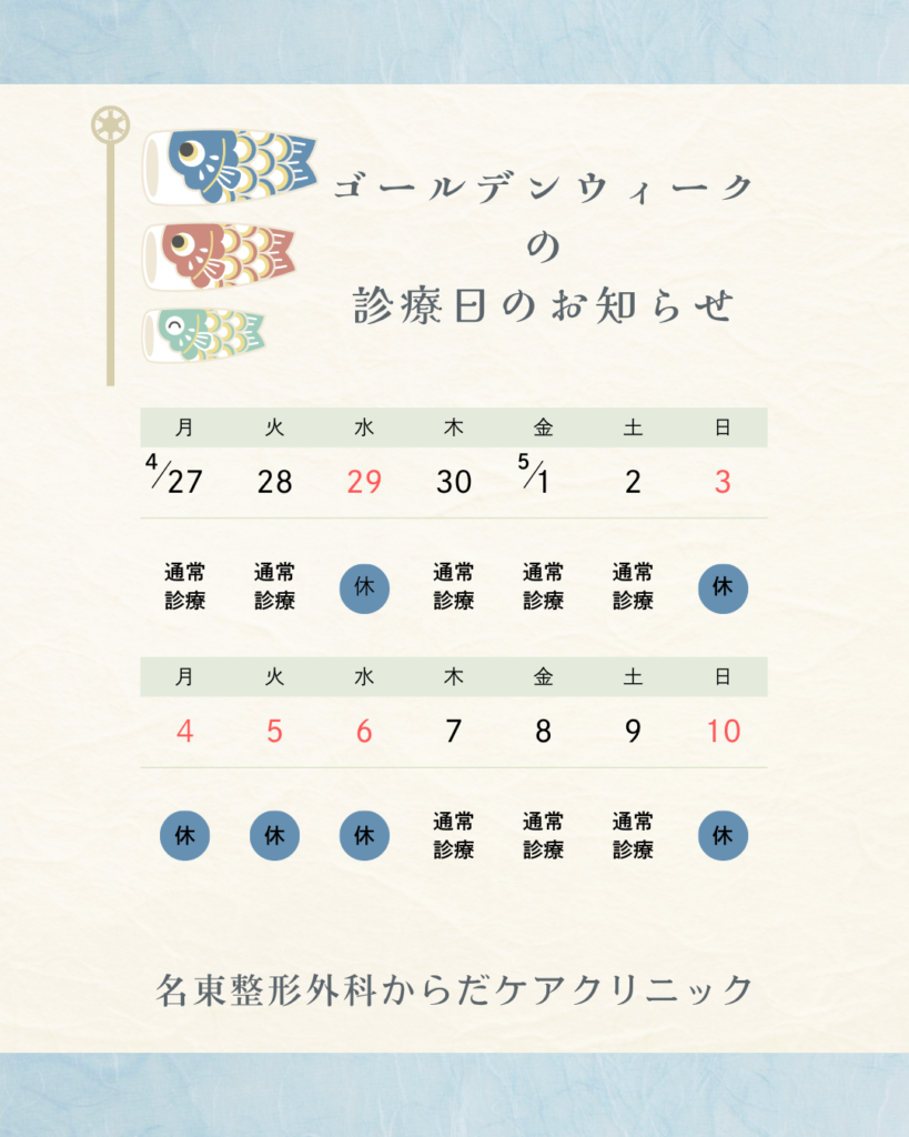 ゴールデンウィーク期間中の診療日のお知らせです。