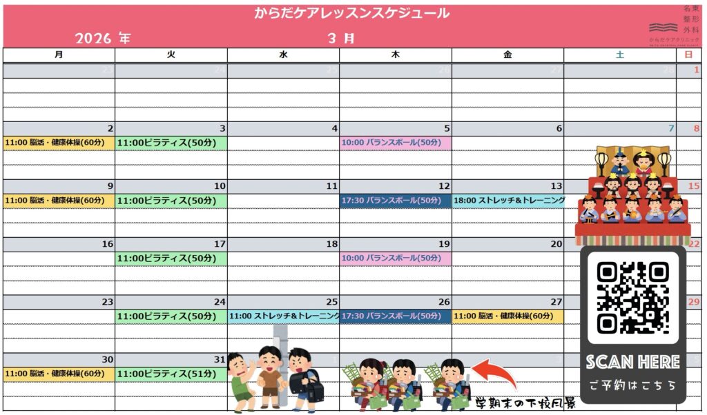 3月のからだケアレッスンスケジュールになります。 ★キャンセル規定★ 当日キャンセルは連絡の有無に関わらず、レッスン料金の100%をキャンセル料として頂きます。 キャンセルのご連絡は前日までにお願いします。 ご理解とご協力の程よろしくお願い致します。 ★混合診療について★ 保険診療と自費診療の同日受診ができません。 かMORE