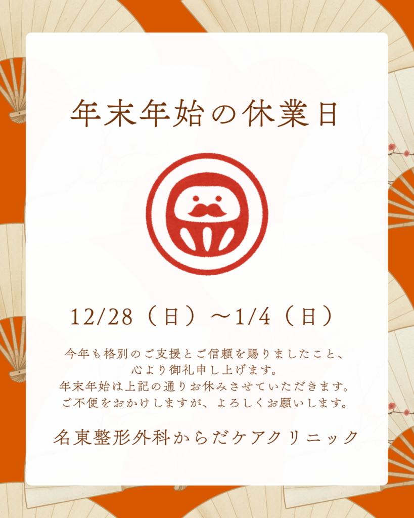 12/28(日)〜1/4(日)を休診日とさせていただきます。 年始は1/5(月)から開始いたします。 どうぞ良いお年をお迎えください★MORE